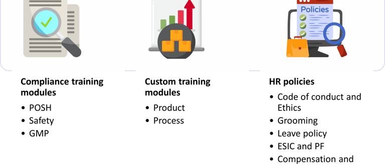 Choose across Compliance modules, HR policies or get custom modules for your product and process training. Establish a full fledged Learning and Development program within atractive budgets. Opt for more as per your requirements!